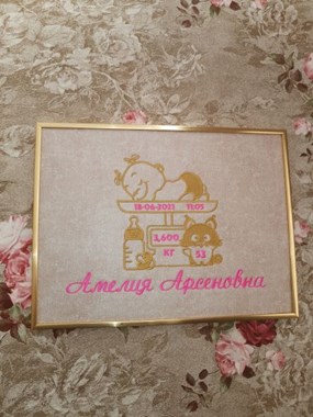 Детские метрики от DeMetrikoff это роскошный подарок представляющий из себя картину в рамке или багете, выполненные методом вышивки, по индивидуальным данным заказчика. Вы можете выбрать не только дизайн макета, тип багета, материал на котором будет выполнена вышивка, а так же цветовую гамму детской метрики от DeMetrikoff, одноцветное или двухцветное, из множество ниток представленных на выбор.